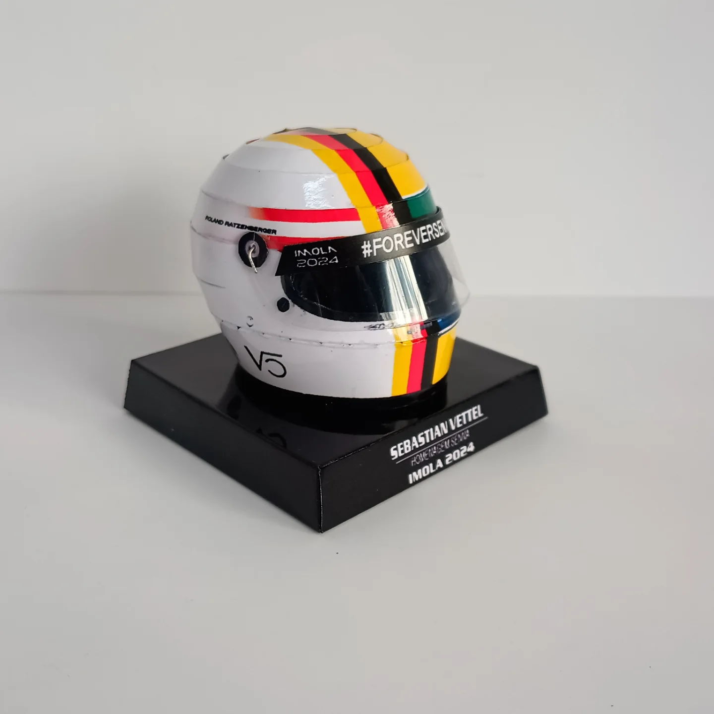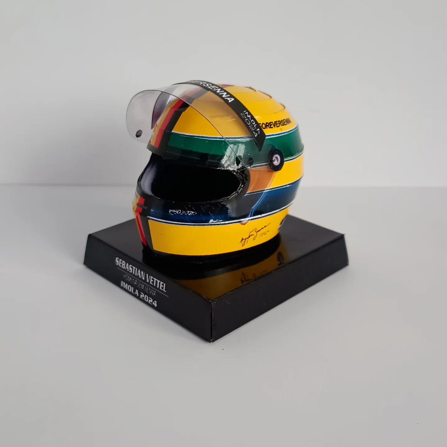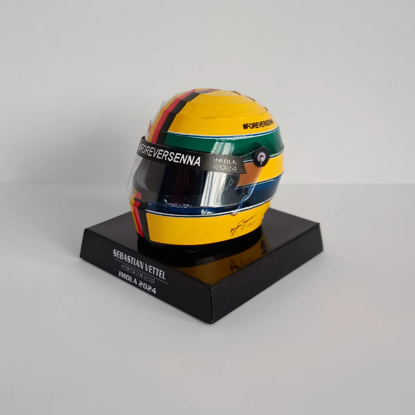 O belíssimo capacete que o tetracampeão Sebastian Vettel usou em Imola, 2024, em homenagem ao aniversário de 30 anos da morte de Ayrton Senna.
